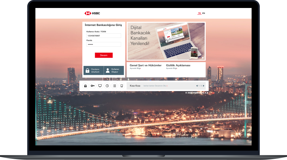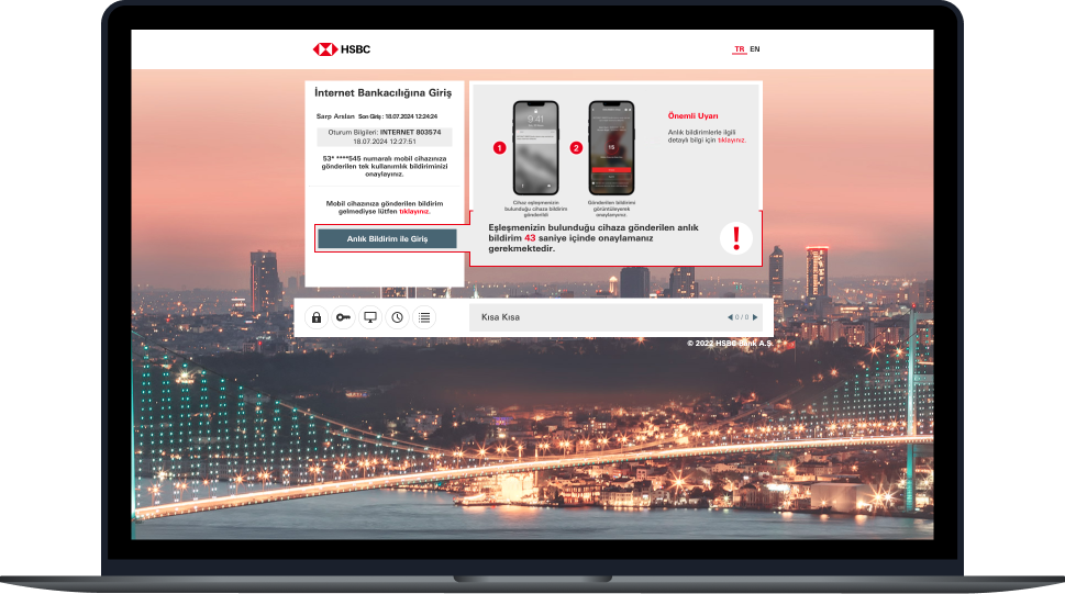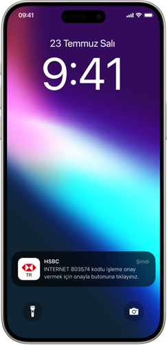 HSBC Mobil Bankacılık uygulamasını aktif olarak kullanan müşterilerimiz İnternet Bankacılığı uygulamasına giriş yaparken mobil uygulamanın aktif olduğu cihaza gönderilen anlık bildirimi onaylayarak giriş yapabilirler.