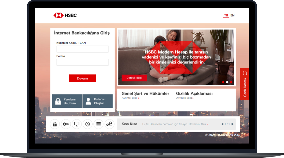 Akıllı telefonu ya da tabletini HSBC Mobil Bankacılık Uygulaması ile eşleştirmemiş müşterilerimiz ise, HSBC İnternet Bankacılığı uygulamasına sadece SMS Tek Kullanımlık Şifre ile yapabilir ve sınırlı bir işlem setinden faydalanabilir.